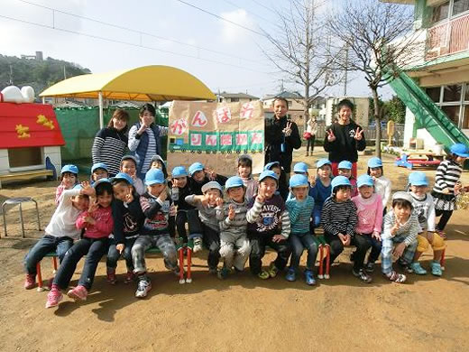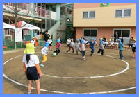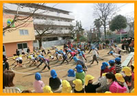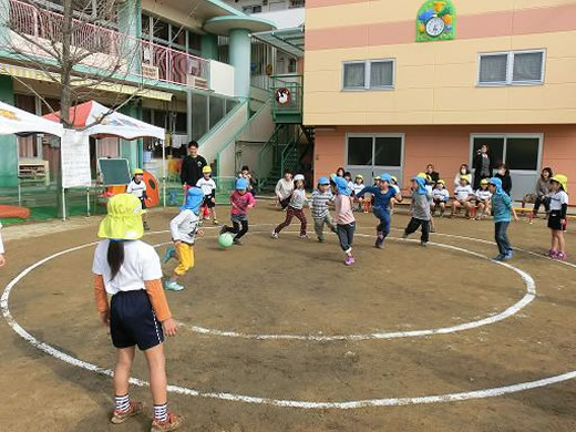 年に一回、パールズ体操教室の一環で姉妹園の愛光保育園と年長児が、ドッヂボール大会を実施しています。当日は、小さなクラスの子どもたちもお兄さん・お姉さんを一生懸命応援。園全体が、ひとつになって楽しんでいます。