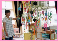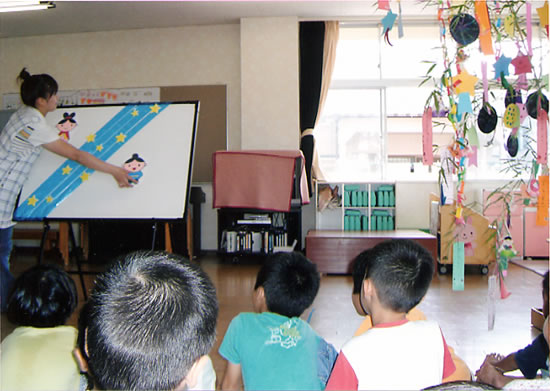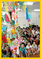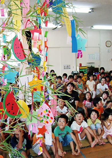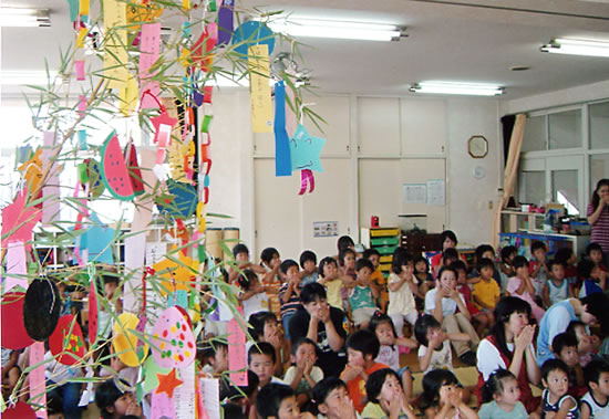 「今年の願いごとは、何にしようかな・・・」親子のこんな会話からはじまるたなばたまつり。子どもたちは、たんざくに願いごとを書いたり・七夕かざりをつくったり・・・そして、当日の七夕集会では、おりひめ・ひこぼしのお話を聞いて、空や星への夢をふくらませます。
