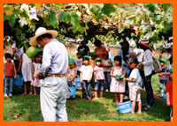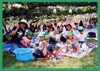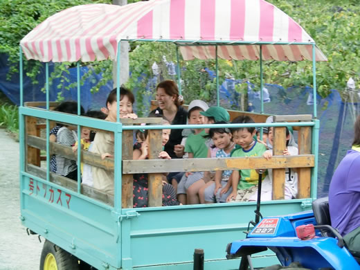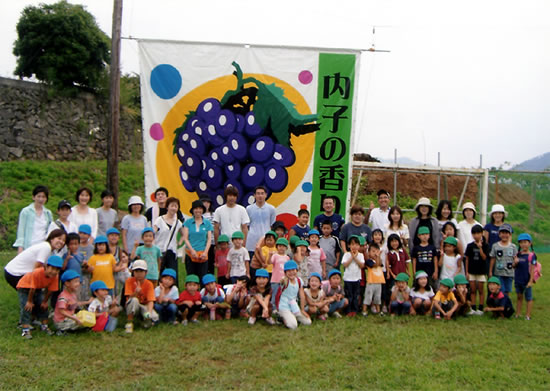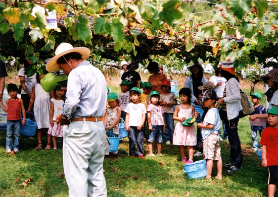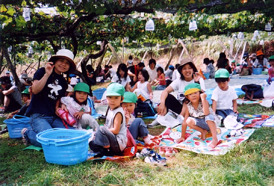 ぶどうが、きれいに色づく頃、子どもたちは、バスに乗って内子のぶどう園にぶどう狩りに出かけます。おいしいぶどうやお弁当で、おなかいっぱいになった後は、自然の中で、子どもたちが大好きな虫さがし・散歩などを 楽しみます。