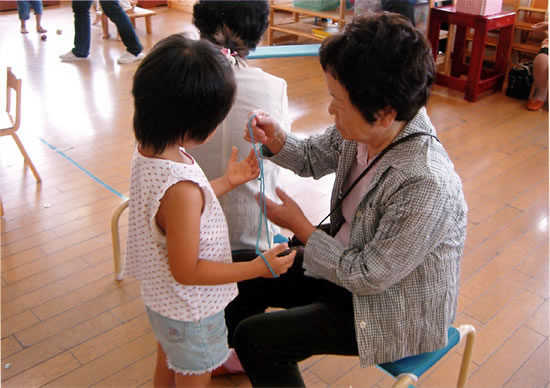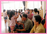 保育園におじいちゃん・おばあちゃんをご招待し、わらべ歌遊び・けん玉・あやとり・・・などなつかしい遊びを一緒に楽しんだり、「いつまでも、元気でね・・・」の願いをこめて、子どもたちが、お手紙を書いたりして、敬老の日をお祝いしています。