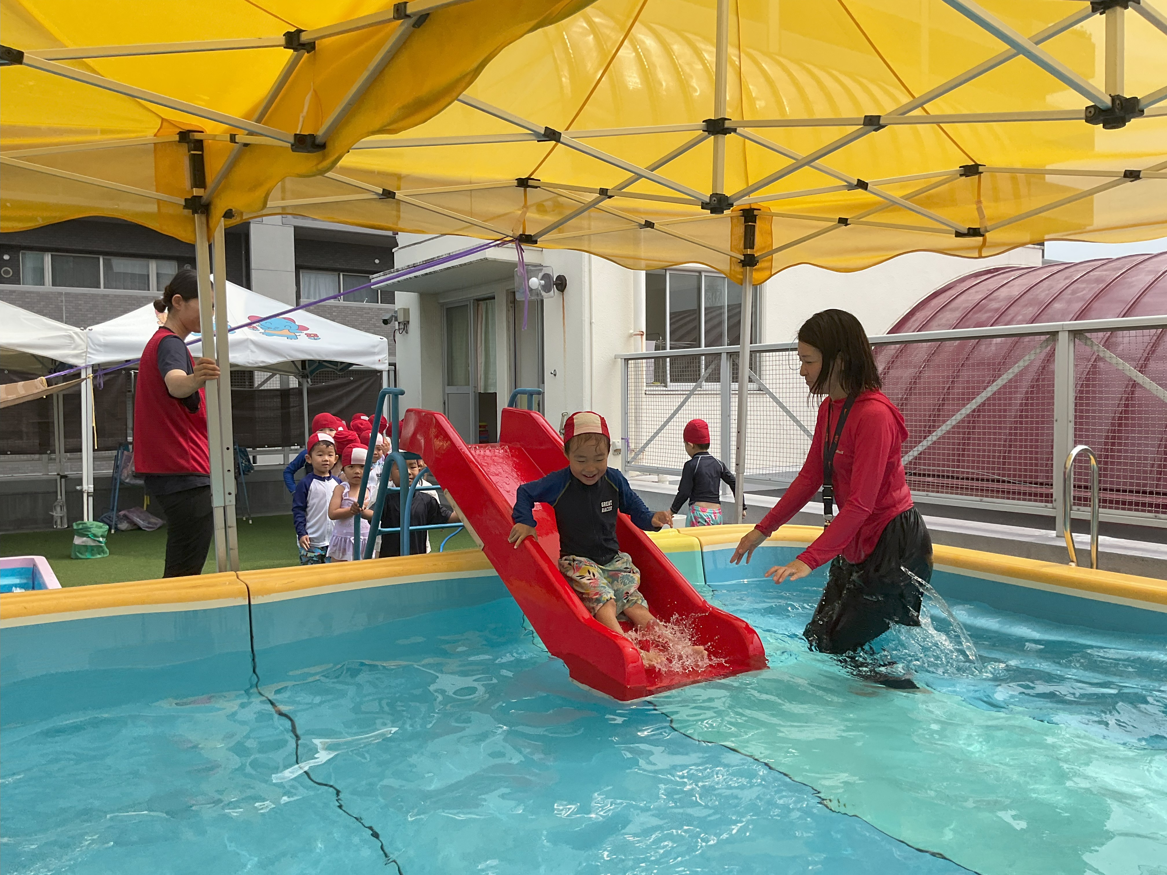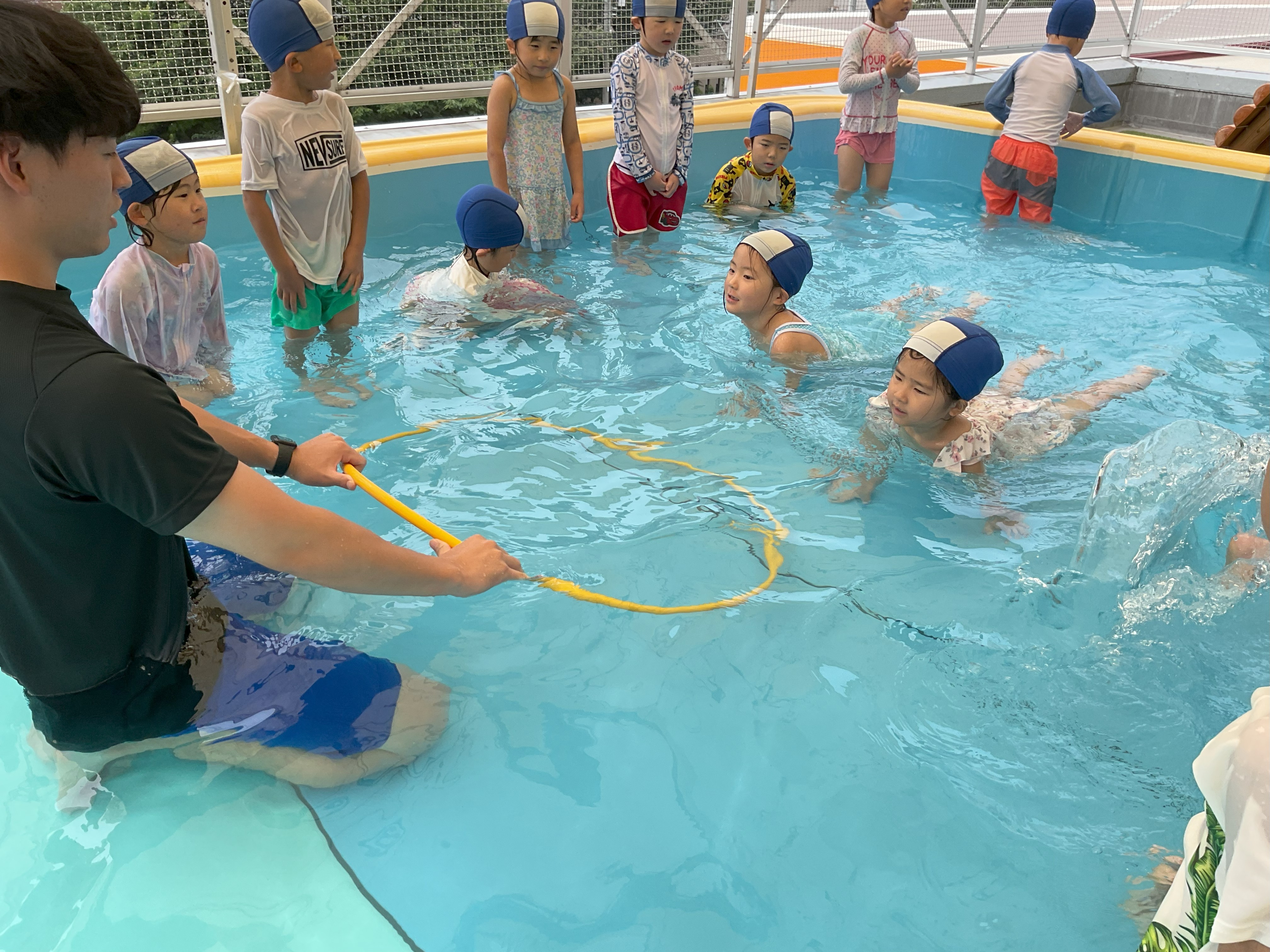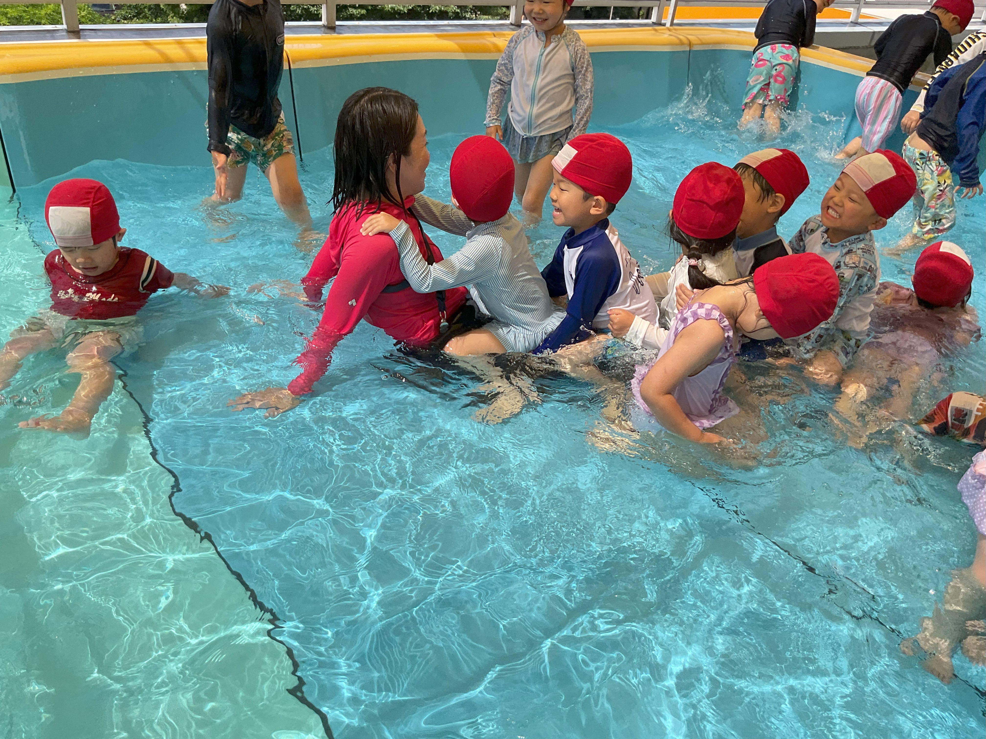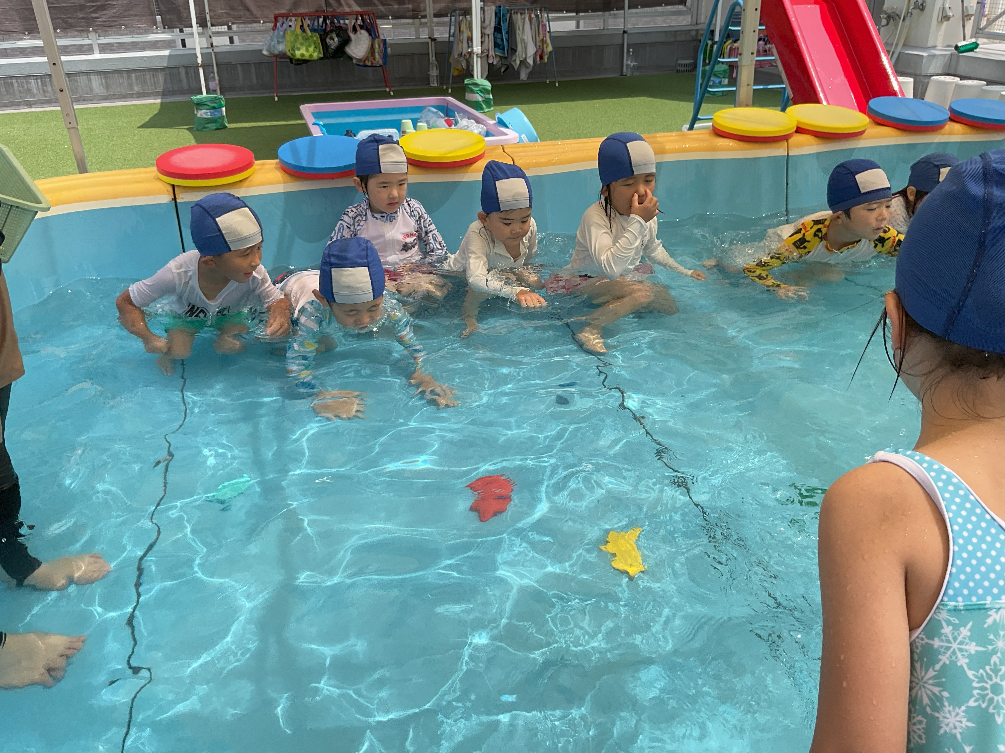 (きりん) 待ちに待ったプール開き!!今年はきりん組も遊びの延長でプール掃除をしてピカピカに しました。初めはちょっぴりドキドキしていたお友だちも今では最後までプールの中で 楽しそうに遊んでいます。顔つけやワニ歩き、バタ足など、できるようになったことを 見せ合う姿は微笑ましいです。