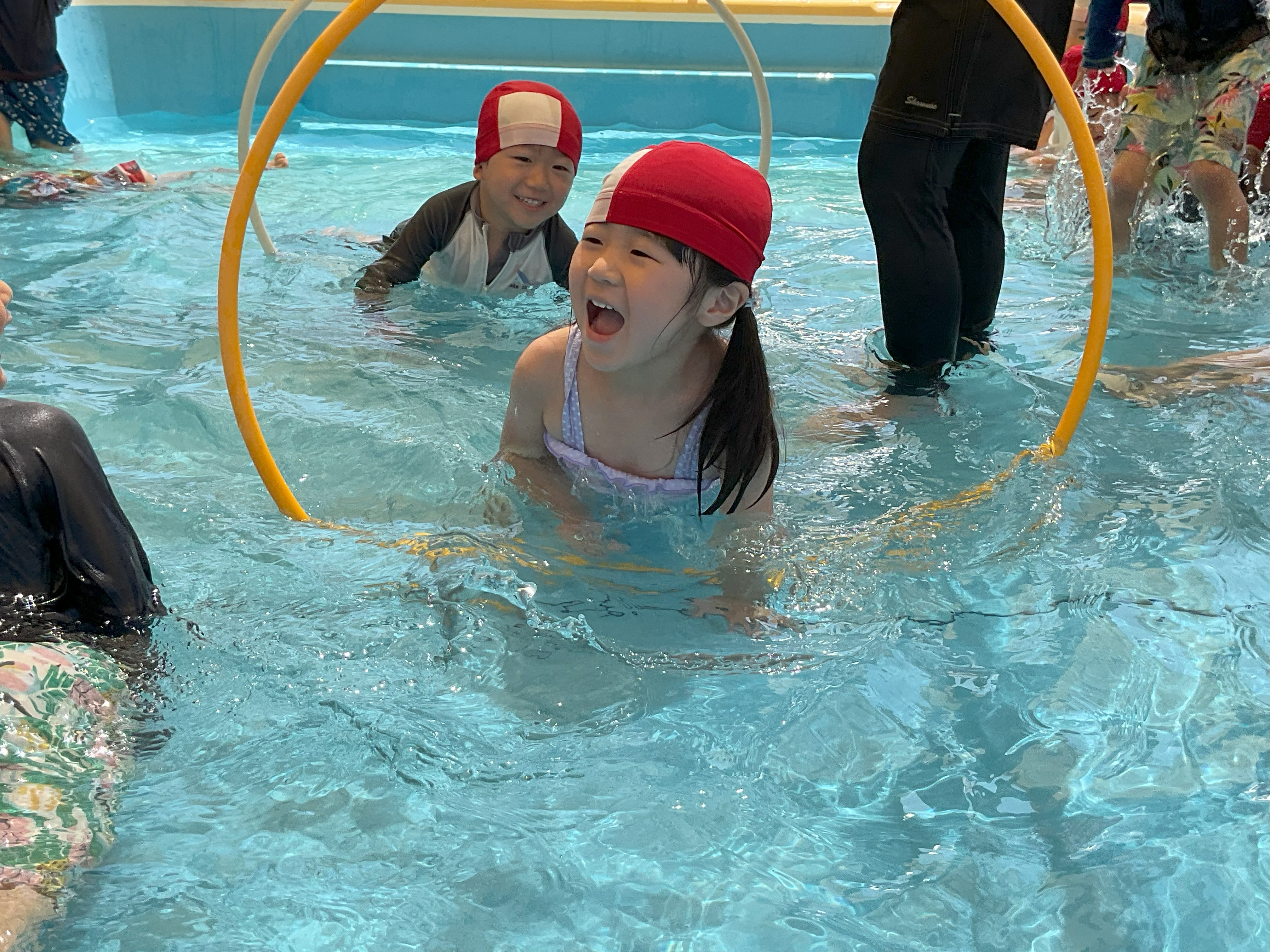 (ぞう) みんなが大好きなプールあそび。全身で水の気持ち良さを味わって楽しんでいる子どもたちです。 ぞう組では顔つけをはじめ、バタ足で泳いだり潜ってみたりすることにも挑戦!! 苦手な子も少しずつやってみようと頑張っていますよ。 |