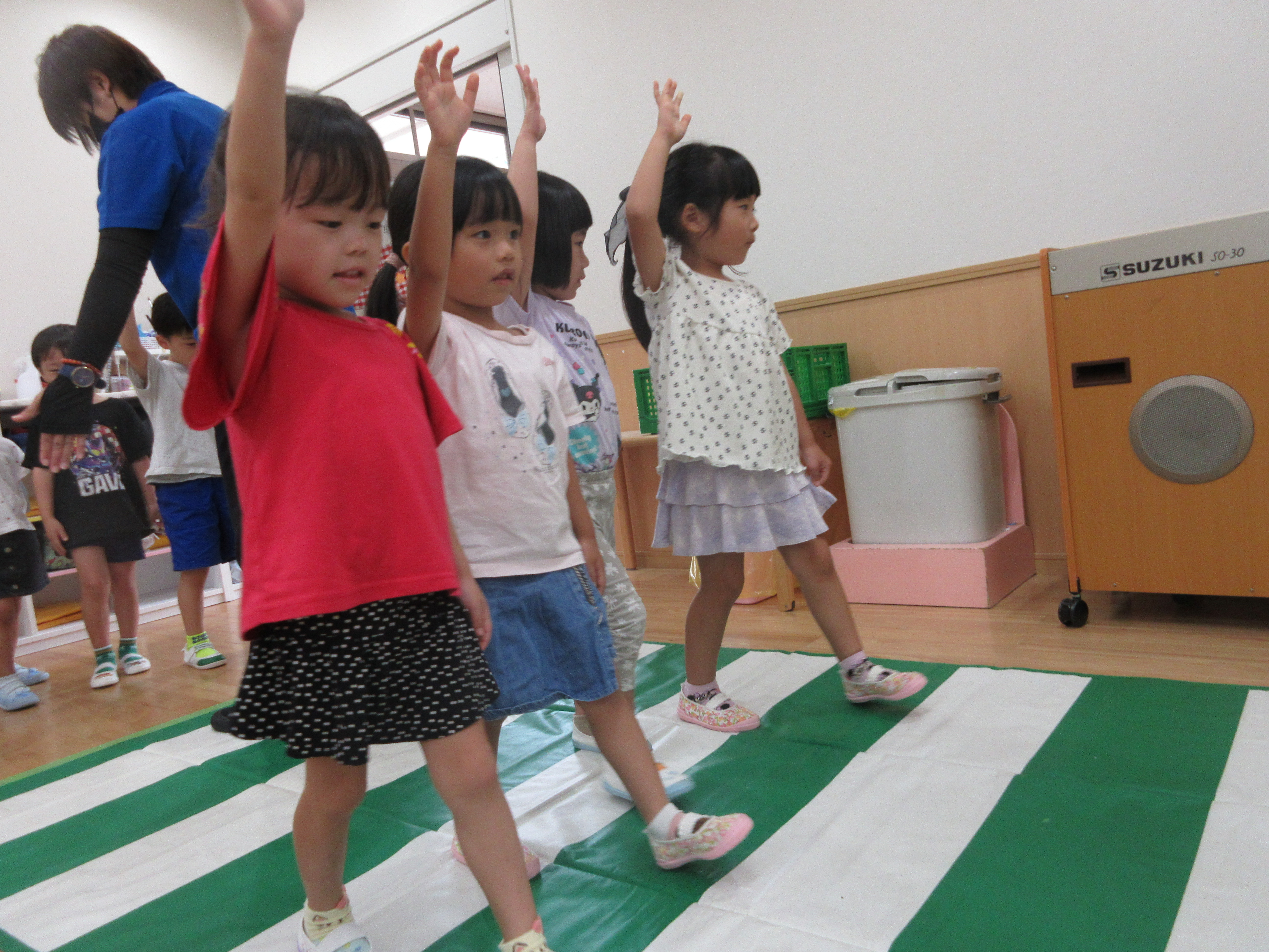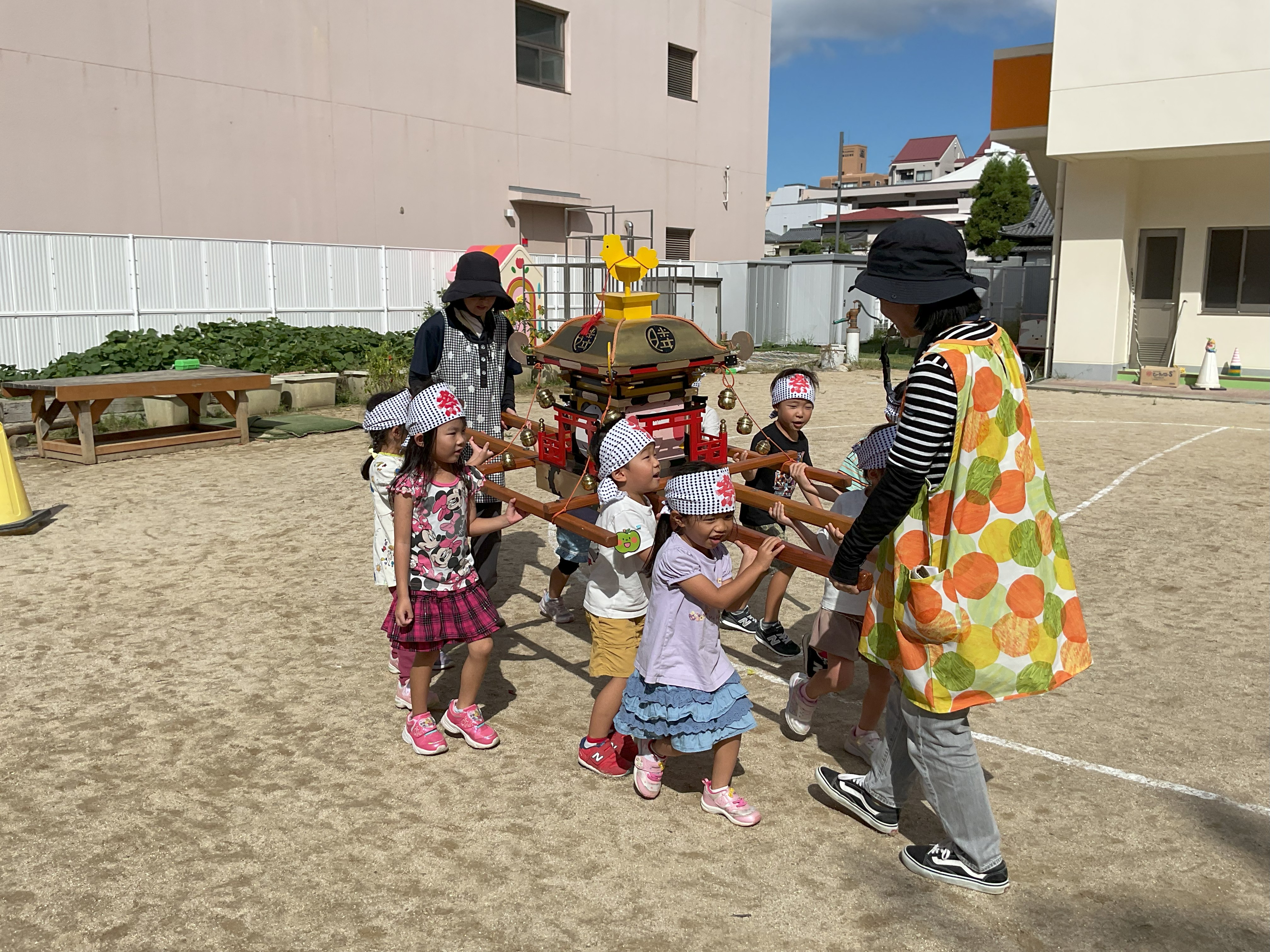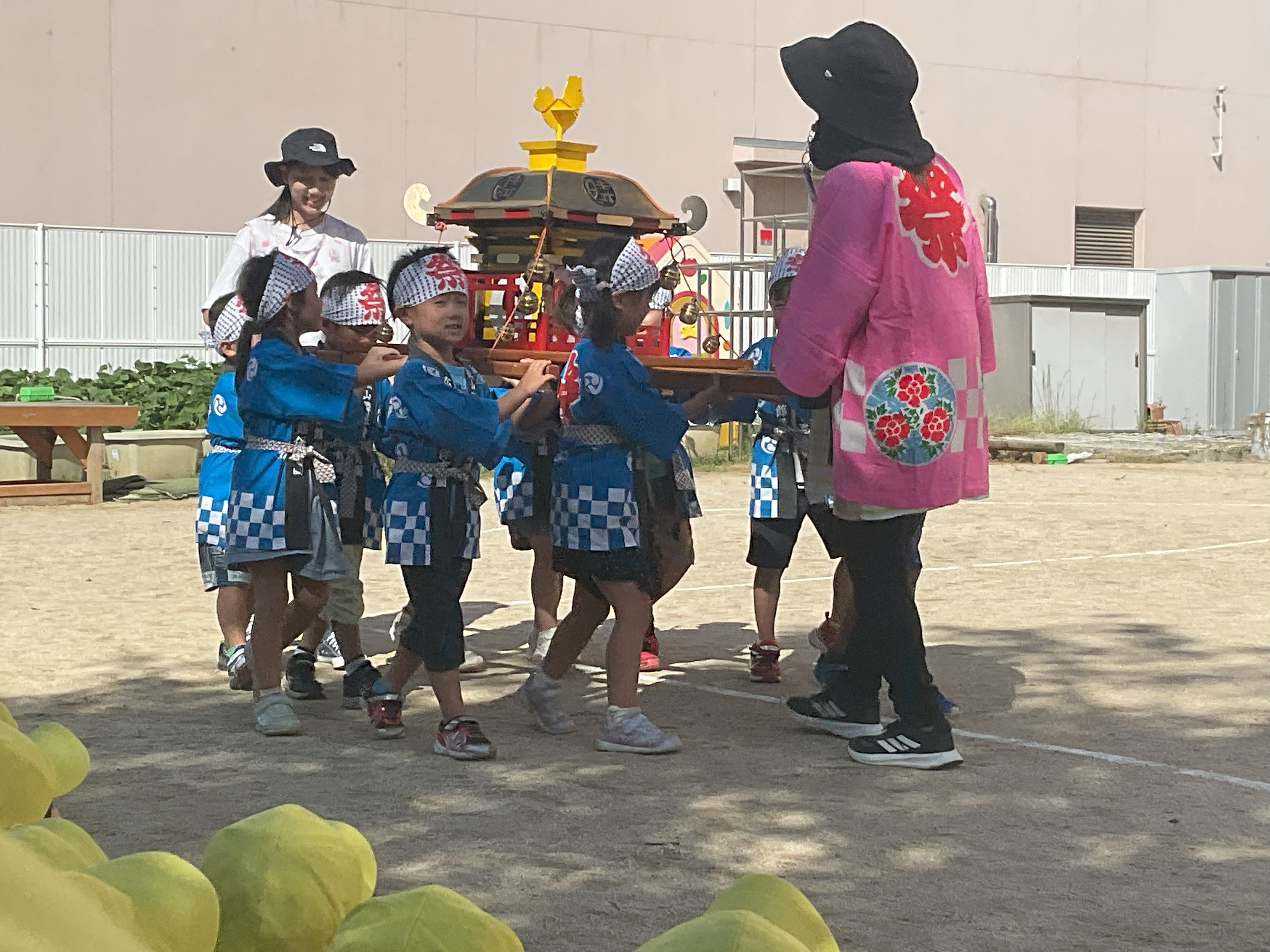 保育園でおまつりごっこをしました。「わっしょい!」「わっしょい!」の 元気な掛け声に合わせてお神輿を担いで園庭を練り歩きました。 小さいクラスのお友だちも掛け声に合わせ、手を叩きながら嬉しそうに 見ていました。保育園でもすっかりおまつりモードです♪ |