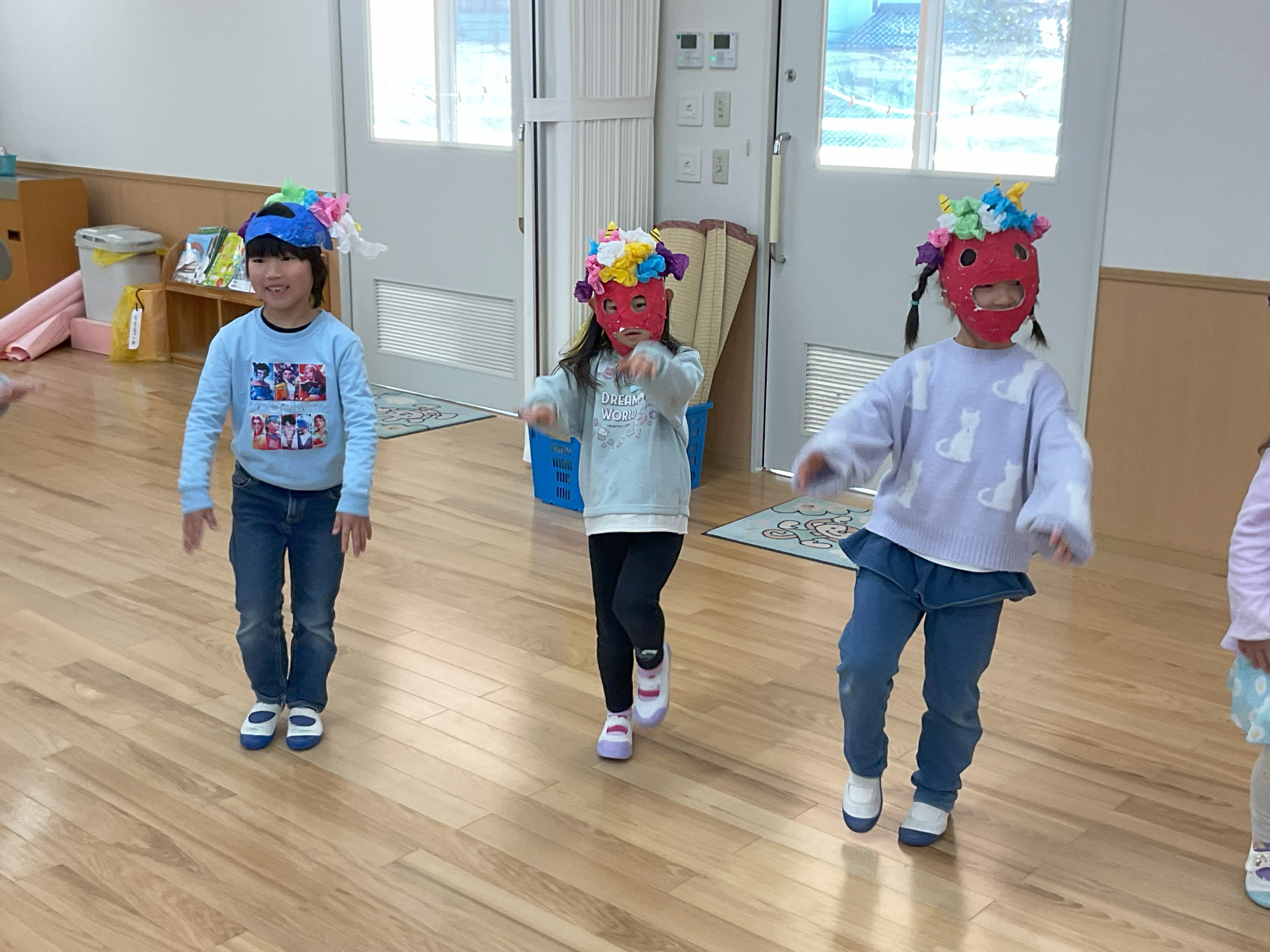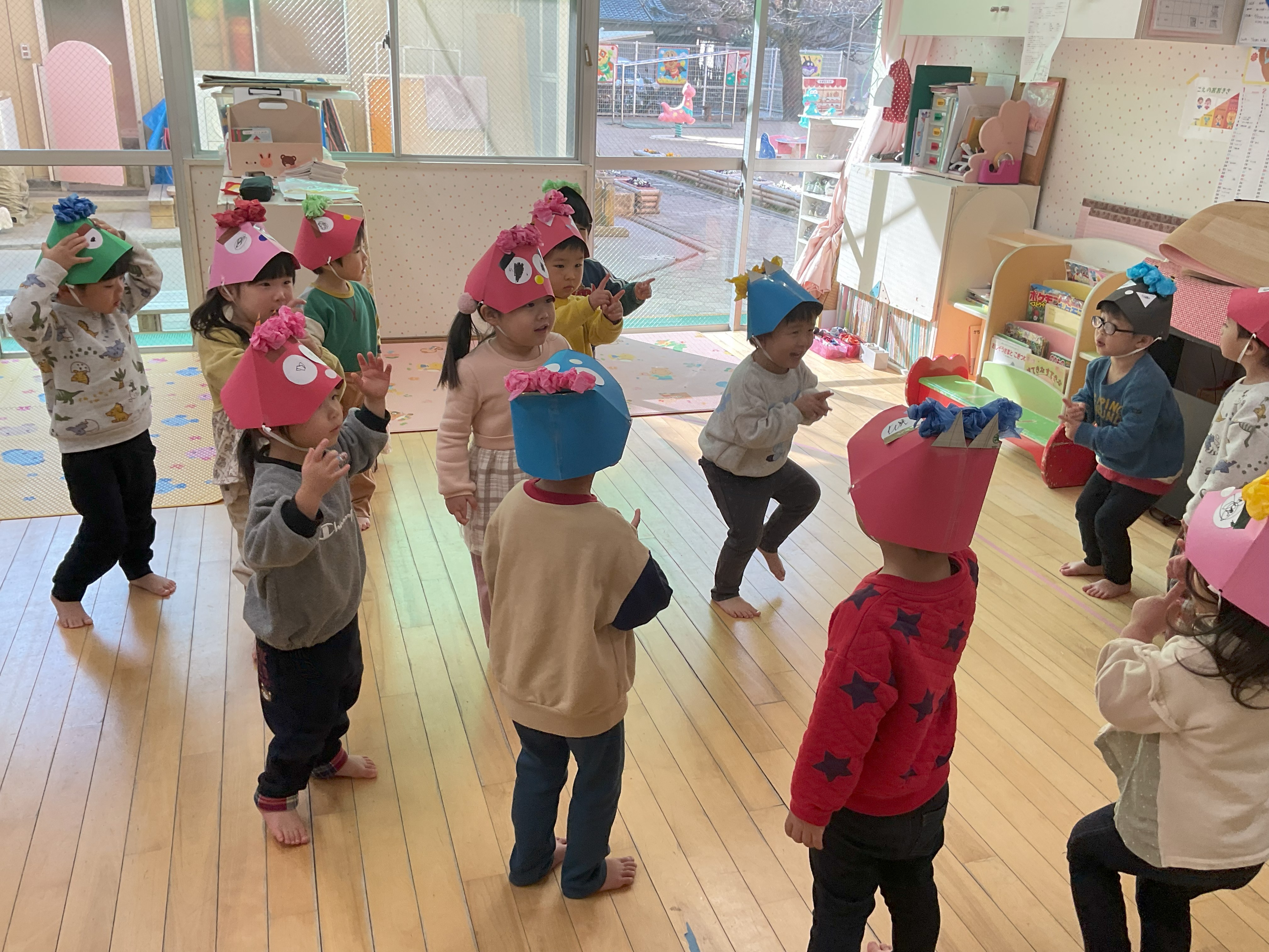 「鬼くるかな…」と朝からちょっぴりドキドキしていた子どもたちですが、 今年は保育士が鬼役をすることを伝えていたので、みんなで楽しく豆まきをし、 鬼退治をすることができました。 集会では鬼食いやひいらぎなど鬼が苦手な物の話も真剣な顔で聞いていましたよ!